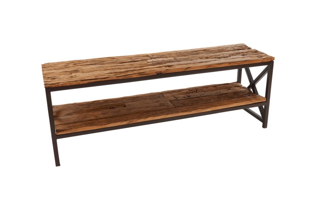 Très beau banc en bois recyclé sur pied métallique. Vous disposez de deux étagères pour y mettre des affaires ou également utiliser ce meuble pour y mettre votre télévision ou comme meuble à chaussures.