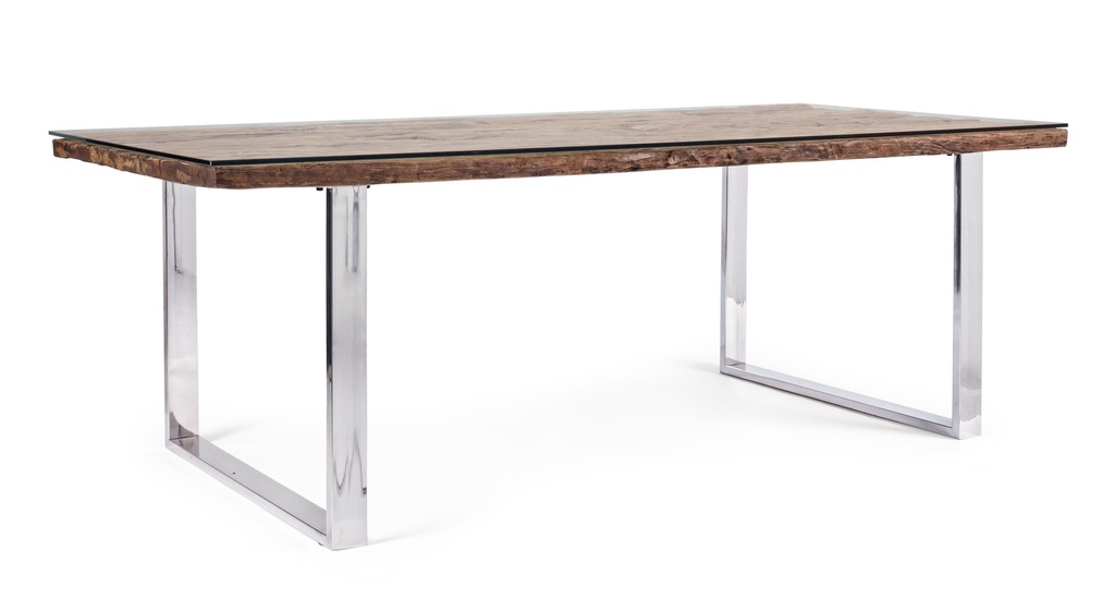 Les pieds en acier inoxydable chromé apportent une touche de modernité raffinée, contrastant élégamment avec l’aspect brut du bois recyclé. Leur finition brillante assure une stabilité parfaite tout en ajoutant une note sophistiquée à l’ensemble.